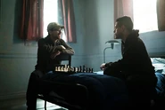 Halloween of the previous year Mr. Robot emerged for the first time and suggested the hack to Darlene while Elliot wore the fsociety mask. In the present Elliot rejects her plea for help. Mr. Robot states that if Elliot can beat him in chess he will leave forever. Though Krista advises against it, Leon tells him to fight for what he wants; however the matches end in three stalemates. Dominique finds a bullet case in the arcade. While the Whiterose pressures Phillip to stay on their schedule and monitors the FBI, Angela assumes he wants her to settle the class action lawsuit over the toxic leak after she turns in the other executives, though he rebuffs her theory. Joanna is running low on funds while she pays the parking attendant who found Tyrell's SUV during the hack to stay quiet. Scott rejects her offer to testify against Tyrell in exchange for Tyrell's severance pay. Cisco tells Darlene that the Dark Army wouldn't have killed Leslie Romero, whose murder might have something to do with an illegal FBI surveillance program called Project Berenstain. Elliot agrees to help Ray but secretly uses the computer to contact Darlene and hack the FBI.